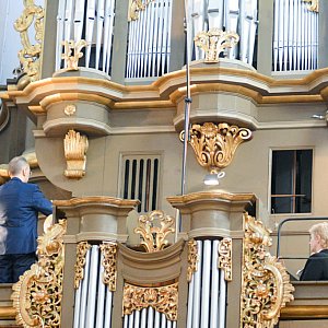 W tzw. międzyczasie, Marcin Lauzer przeprowadzał prelekcję o tematyce instrumentu. Przypominał brzmienie organów w różnych epokach, od renesansu po czasy współczesne. Warto zaznaczyć, że instrument ten potrafi naśladować całą orkiestrę, wydawane dźwięki to między innymi trąbki, smyczki, puzony, a większość z nich wydaje wysokie i niskie tony.