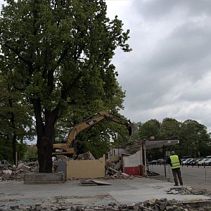 Rozbiórka budynku trwa od kilku dni. W pierwszym etapie rozebrano lekkie konstrukcje i odsłonięto charakterystyczne drzewo, rosnące w środku budynku i stanowiące jego część.