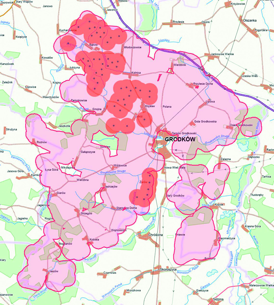 Ten jasnoróżowy obszar na terenie gminy Grodków, otoczony ciemnoróżowym konturem o zaokrąglonych brzegach, to wyrysowane i połączone potencjalne 700-metrowe strefy oddziaływania wiatraków – gdyby zostały rozmieszczone na działkach wskazanych przez wnioskodawców. Strefę rysowaliśmy w odległości 630 metrów od granicy działki, zakładając, że sam wiatrak stałby 70 metrów w głąb działki. Przyjęliśmy taką wartość, ponieważ typowa średnica wirnika to około 140 metrów, a jego łopaty nie powinny wystawać poza obrys działki. Mamy świadomość, że w jednym miejscu wizualizacja może być lekko przekłamana – jedna z działek jest tak wąska, że wirnik wyszedłby poza jej granice. Jednak dla poglądowego przedstawienia sytuacji nie ma to większego znaczenia. Zdajemy sobie również sprawę, że strefy oddziaływania nie powinny nachodzić na zabudowania mieszkalne, i najprawdopodobniej inwestorzy poprowadzą granice stref tuż przy krawędziach budynków mieszkalnych, czyli obecnie w odległości 700 metrów. Jeśli jednak zmieni się ustawa i minimalna odległość zostanie skrócona do 500 metrów, wiatraki zostaną przesunięte bliżej – z takim samym skutkiem. Pozostawiliśmy widoczne przykrycie miejscowości przez strefy, aby każdy mieszkaniec miał świadomość, że wiatraki będą wokół – i że nawet jeśli formalnie strefa ma 700 metrów, to oddziaływanie może być odczuwalne mimo wszystko.