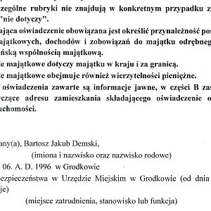 W swoich oświadczeniach majątkowych Demski wykazuje jedynie dochody z urzędu – do lipca zarobił tam trochę ponad 48 tysięcy złotych. Biorąc pod uwagę, że „przytulił” jeszcze trzynastkę za zeszły rok, jego miesięczna pensja powinna wynieść troszkę ponad 6000 złotych. O ile, oczywiście, nie „zapomniał” czegoś wpisać.