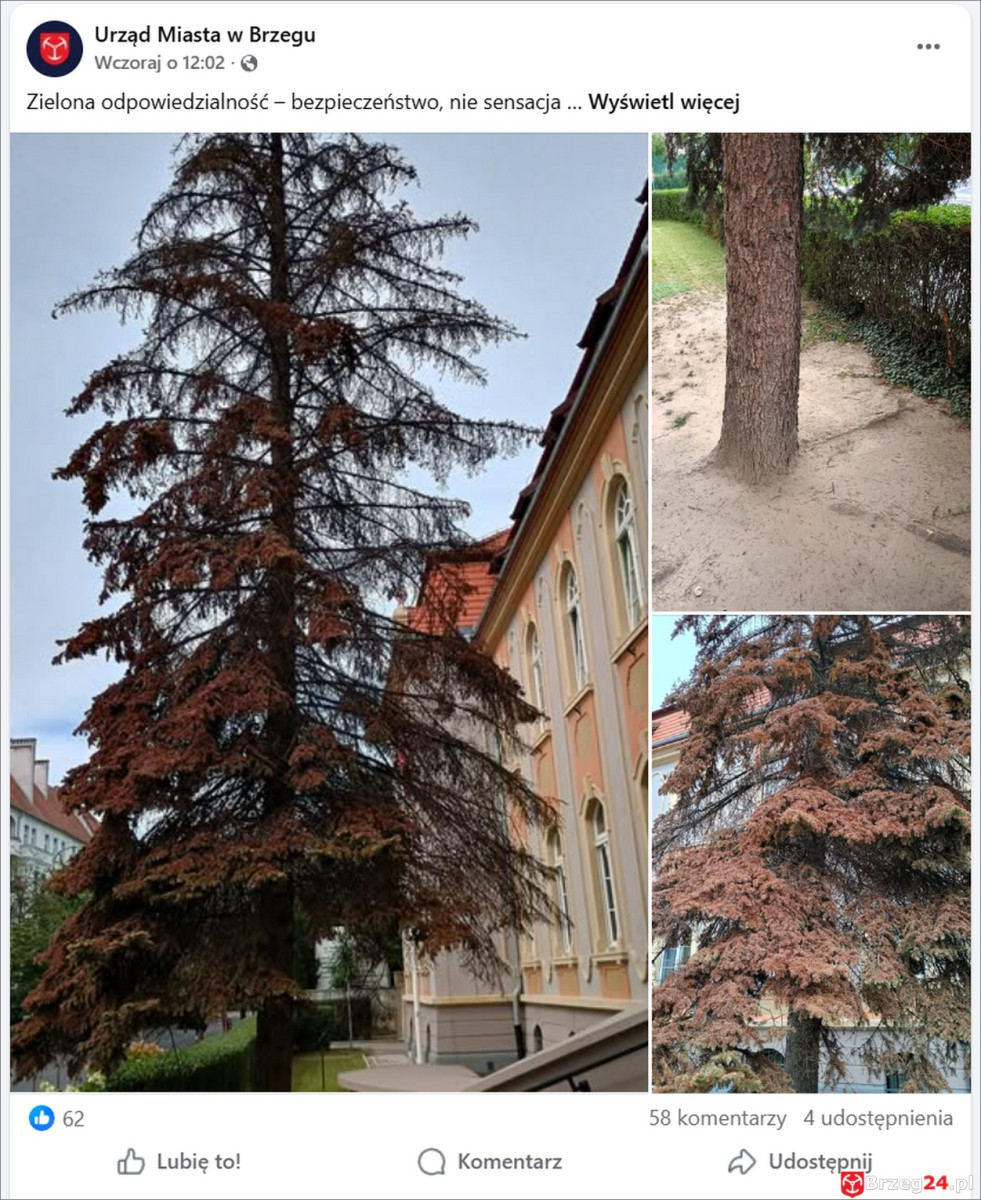 Urząd potwierdził również, że nie wykonano żadnej ekspertyzy dendrologicznej drugiego drzewa. Oznacza to, że komunikat opublikowany w mediach społecznościowych wprowadzał mieszkańców w błąd, sugerując, że oba świerki były w takim samym stanie jak to całkowicie obumarłe.