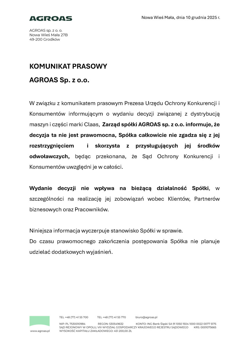 W związku z komunikatem prasowym Prezesa Urzędu Ochrony Konkurencji i Konsumentów informującym o wydaniu decyzji związanej z dystrybucją maszyn i części marki Claas, Zarząd spółki AGROAS sp. z o.o. informuje, że decyzja ta nie jest prawomocna, Spółka całkowicie nie zgadza się z jej rozstrzygnięciem i skorzysta z przysługujących jej środków odwoławczych, będąc przekonana, że Sąd Ochrony Konkurencji i Konsumentów uwzględni je w całości.