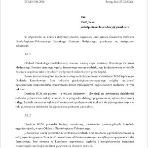 Odpowiedź przekazało Brzeskie Centrum Medyczne za pośrednictwem starosty Jacka Monkiewicza. W piśmie podkreślono, że oddział ginekologiczno położniczy stanowi ważną część struktury szpitala i mimo ujemnego wyniku finansowego jego funkcjonowanie ma istotne znaczenie dla bezpieczeństwa zdrowotnego mieszkańców powiatu.
