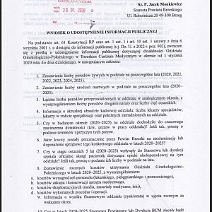 Pod koniec stycznia skierowali oni do Starostwa Powiatowego w Brzegu wniosek o udostępnienie informacji publicznej dotyczącej funkcjonowania oddziału ginekologiczno położniczego w Brzeskim Centrum Medycznym. Pytania dotyczyły między innymi liczby porodów w ostatnich latach, sytuacji kadrowej, ewentualnych przerw w pracy oddziału, kosztów jego utrzymania oraz planów władz powiatu wobec przyszłości oddziału.