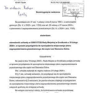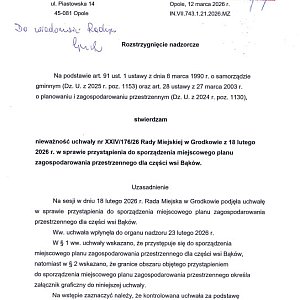 Wojewoda opolski unieważnił dwie uchwały Rady Miejskiej w Grodkowie podjęte 18 lutego 2026 roku. Dotyczyły one przystąpienia do sporządzenia miejscowych planów zagospodarowania przestrzennego dla części wsi Bąków oraz części wsi Starowice Dolne. Oba dokumenty miały otworzyć drogę do dalszych prac planistycznych związanych z lokalizacją magazynów energii, które zgodnie z uzasadnieniami miały być realizowane jako układy hybrydowe w ramach działających farm wiatrowych.