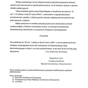 W rozstrzygnięciach nadzorczych wskazano wprost, że granice obszaru planu powinny być wyznaczone jednoznacznie, co do zasady w oparciu o granice działek ewidencyjnych. Tymczasem w uchwałach Grodkowa przyjęto rozwiązanie, które według wojewody narusza art. 14 ust. 1 i 2 ustawy o planowaniu i zagospodarowaniu przestrzennym. To z kolei zostało uznane za istotne naruszenie prawa, skutkujące nieważnością obu uchwał.