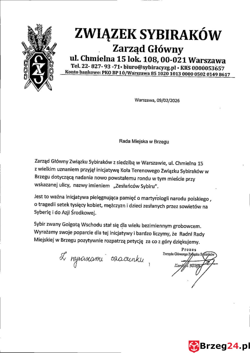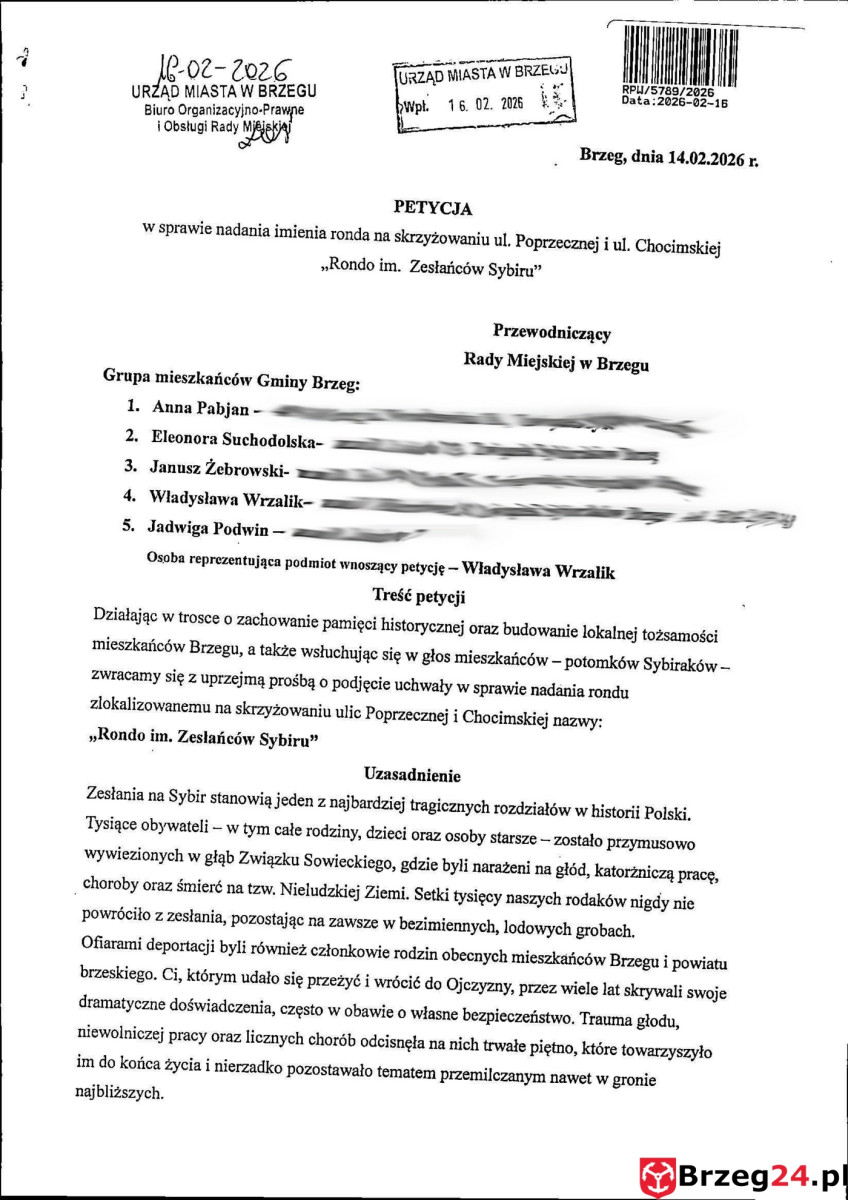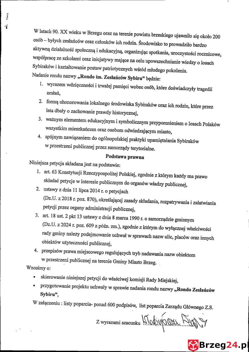 Pierwsza to inicjatywa Koła Terenowego Związku Sybiraków w Brzegu. Organizacja złożyła formalną petycję o nadanie nazwy „Rondo im. Zesłańców Sybiru”. Wniosek nie jest symboliczny. Za inicjatywą stoją konkretne liczby i środowisko. Do petycji dołączono listy poparcia z ponad 600 podpisami mieszkańców. Dodatkowo projekt został oficjalnie poparty przez Zarząd Główny Związku Sybiraków w Warszawie.