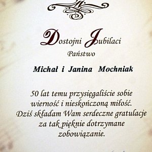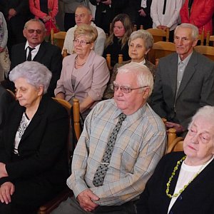 Specjalnie wyróżniono państwa Annę i Stefana Zbroję obchodzących dzisiaj 60 rocznicę ślubu - Diamentowe Gody. Państwo Zbroja "tak" powiedzieli sobie w 1955 roku. Wcześniej wszyscy małżonkowie odnowili przyrzeczenie małżeńskie. Z ust pani Zuzanny Bieleckiej, z-cy kierownika USC w Brzegu padły znamienne słowa, które powtarzali jubilaci : " Żono - mężu, dziękuję Ci za te wspólne przeżyte lata, za Twoją miłość, troskę, opiekę i przyrzekam uczynić wszystko, by nasze małżeństwo było zgodne i szczęśliwe". Szczęście dopisało też panu Michałowi Mochniakowi, urodzony w podlwowskich Prusach, dzisiaj dodatkowo obchodził 76 rocznicę urodzin. Jest podwójna okazja do świętowania dodaje żona pana Michała - Janina. Poznaliśmy się przeszło 50 lat temu na zabawie tanecznej w Michałowicach. Mąż to zapalony muzyk, ja natomiast uwielbiam śpiewać. W uroczystości uczestniczyły rodziny jubilatów, a na wszystkich uczestników ceremonii czekał poczęstunek lampką szampana.