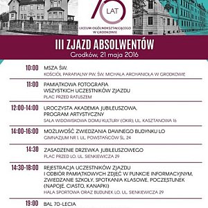 W sobotę 21.05.2016, w Grodkowie zorganizowany zostanie III Zjazd Absolwentów tamtejszego Liceum Ogólnokształcącego. W tym roku impreza włączona jest w obchody 70. rocznicy istnienia szkoły. Uroczystości trwać będą właściwie przez cały dzień. Na zakończenie odbędzie się Bal 70-lecia. Szczegóły na plakacie.