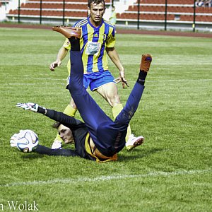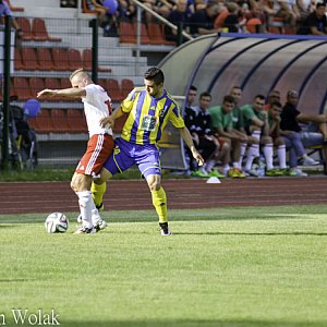 Druga połowa to znacznie lepsza gra naszej drużyny w przodzie ale niestety w obronie zdarzały się "głupie" błędy. Zaczęliśmy od uderzenia Bonara, obok bramki. Dwie minuty później po sprytnym rozegraniu rzutu wolnego w dobrej sytuacji był Boczarski ale jego strzał instynktownie obronił bramkarz! To była bardzo dobra sytuacja. Niestety w 50 minucie padł drugi cios. Fatalne rozegranie na lewej stronie i przejęcie piłki przez rywali kończy się drugim golem przyjezdnych. Drugi gol gości i drugi prezent! Cztery minuty później Stitou broni kolejne uderzenie gości. Dwie minuty później Gancarczyk, źle kończy kontrę i nic. Wróciliśmy do gry w 60 minucie. Nasi zawodnicy pograli z tyłu po czym poszła szybka piłka do Mikły, ten wrzucił w "16" a najlepiej tam odnalazł się Mazur, który głową umieścił pikę siatce! "Żółto-niebiescy" ruszyli do ataku i na efekty nie trzeba było długa czekać. W 65 minucie, dośrodkowanie z kornera kończy się golem wprowadzonego kilka minut wcześniej Żeglenia. Minutę później ten sam zawodnik będąc w idealnej sytuacji powinien zdobyć trzeciego gola. Mazur zagrał mu idealną piłkę na 10 metr, nasz nowy napastnik uderzył mocno ale niecelnie! W 67 minucie, zmarnowaliśmy kolejną idealną sytuację. Tym razem Gancarczyk uderzał minimalnie obok słupka! Od około 70 minuty gry, widać było że goście słabną fizycznie. W 76 minucie pięknym rajdem popisał się Kulczycki, który zakończył się rogiem. Wrzutka Nowackiego i strzał Kulczyckiego - ociera się od poprzeczki! Za to goście mogli się pochwalić 100% skutecznością. Jedna z nielicznych akcji, błąd Mazura kończy się golem na 2:3! Ale nic to, nasi się nie poddali i kolejny raz pokazali charakter. W 84 minucie akcję stadiony świata przeprowadził Boczarski, którego rajd ze środka boiska zakończył dopiero obrońca gości, wycinając go równo z murawą w polu karnym! Rzut karny! Do jedenastki podszedł Nowacki i pewnie umieścił piłkę w sieci! 3:3! W 88 minucie z rzutu wolnego uderzał jeszcze Józefkiewicz, ale bramkarz na raty złapał jego uderzenie. W 90 minucie, po kornerze dla przyjezdnych piąstkował Stitou i sędzia zakończył te zawody.
