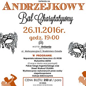 Fundacja Na Rzecz Aktywizacji Osób Starszych i Niepełnosprawnych Pro Sport zaprasza na Andrzejkowy Bal Charytatywny. Impreza odbędzie się w najbliższą sobotę, tj. 26.11.2016r. o godzinie 19:00 w Hotelu Antonio Conference w Skarbimierzu, przy ul. Motoryzacyjnej 2, w Skarbimierzu - Osiedle.