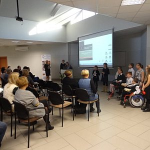 Kolejnym prelegentem był dyrektor PCPR pan Aleksander Podgórny, który szczegółowo omówił różnorodne formy wsparcia osób niepełnosprawnych oraz zadania i rolę PCPR w samorządzie powiatowym. Rehabilitacja osób niepełnosprawnych to zespół działań, w szczególności organizacyjnych, leczniczych, psychologicznych, technicznych, szkoleniowych, edukacyjnych i społecznych, zmierzających do osiągnięcia przy aktywnym uczestnictwie tych osób możliwie najwyższego poziomu ich funkcjonowania, jakości życia i integracji społecznej. Rehabilitacja społeczna ma na celu umożliwienie osobom niepełnosprawnym uczestnictwo w życiu społecznym, natomiast rehabilitacja zawodowa ma na celu ułatwienie tym osobom uzyskanie i utrzymanie odpowiedniego zatrudnienia i awansu zawodowego poprzez umożliwienie im korzystania z poradnictwa zawodowego, szkolenia zawodowego i pośrednictwa pracy. Zadaniem PCPR jest likwidacja barier architektonicznych, w tym w komunikowaniu się i technicznych w związku z indywidualnymi potrzebami osób niepełnosprawnych. Ponadto dofinansowanie warsztatów terapii zajęciowej, zaopatrzenie w sprzęt rehabilitacyjny, przedmioty ortopedyczne, dofinansowanie do turnusów rehabilitacyjnych, sportu, kultury, rekreacji i turystyki.