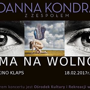 W sobotę (18.02) o godzinie 18:00 w grodkowskim kinie Klaps odbędzie się wyjątkowe wydarzenie. Będzie nim koncert, pn. "Karma na wolności" w wykonaniu Joanny Kondrat z zespołem. Organizatorzy zaprosili na wydarzenie pensjonariuszy z zakładu karnego w Grodkowie, ich rodziny, bliskich i "wolnych" miłośników muzyki do dzielenia wspólnych koncertowych emocji. Za bilety w dniu koncertu zapłacimy 20 zł. Liczba miejsc ograniczona. Więcej informacji znaleźć można tutaj.