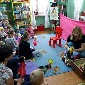 na co dzień w teatrze. Później każdy mógł wykonać własną kukiełkę po czujnym okiem i z pomocą zaproszonego gościa. Następnie, na podstawie "Bajek samograjek" Jana Brzechwy odbyło się przedstawienie "Czerwony Kapturek", w którym "brały udział" kukiełki i ich właściciele. Dzieci bardzo aktywnie uczestniczyły w zajęciach i świetnie wczuwały się w poszczególne postacie. Na zakończenie dzieci poznały historię królika, bohatera książki Margery Williams "Aksamitny królik", czyli jak zabawki stają się prawdziwe. W czerwcu kolejne warsztaty zorganizowane z pedagogiem, neurologopedą i terapeutką z Poradni Psychologiczno - Pedagogicznej w Grodkowie - Jolantą Ilukowicz. W zajęciach uczestniczyły dzieci z rodzicami lub opiekunami. Pani Jolanta omówiła, co wpływa na rozwój mowy dziecka, przedstawiła główne wady wymowy, z jakimi borykają się dzieci w szkol i przedszkolu oraz wyjaśniła najczęstsze przyczyny tych zaburzeń. Podkreśliła też ogromny wpływ wczesnego wprowadzania czytania na rozwój dziecka, a następnie zaprosiła wszystkie dzieci do wspólnej zabawy - wykonywały ćwiczenia oddechowe za pomocą słomki i odgadywały odgłosy zwierząt.