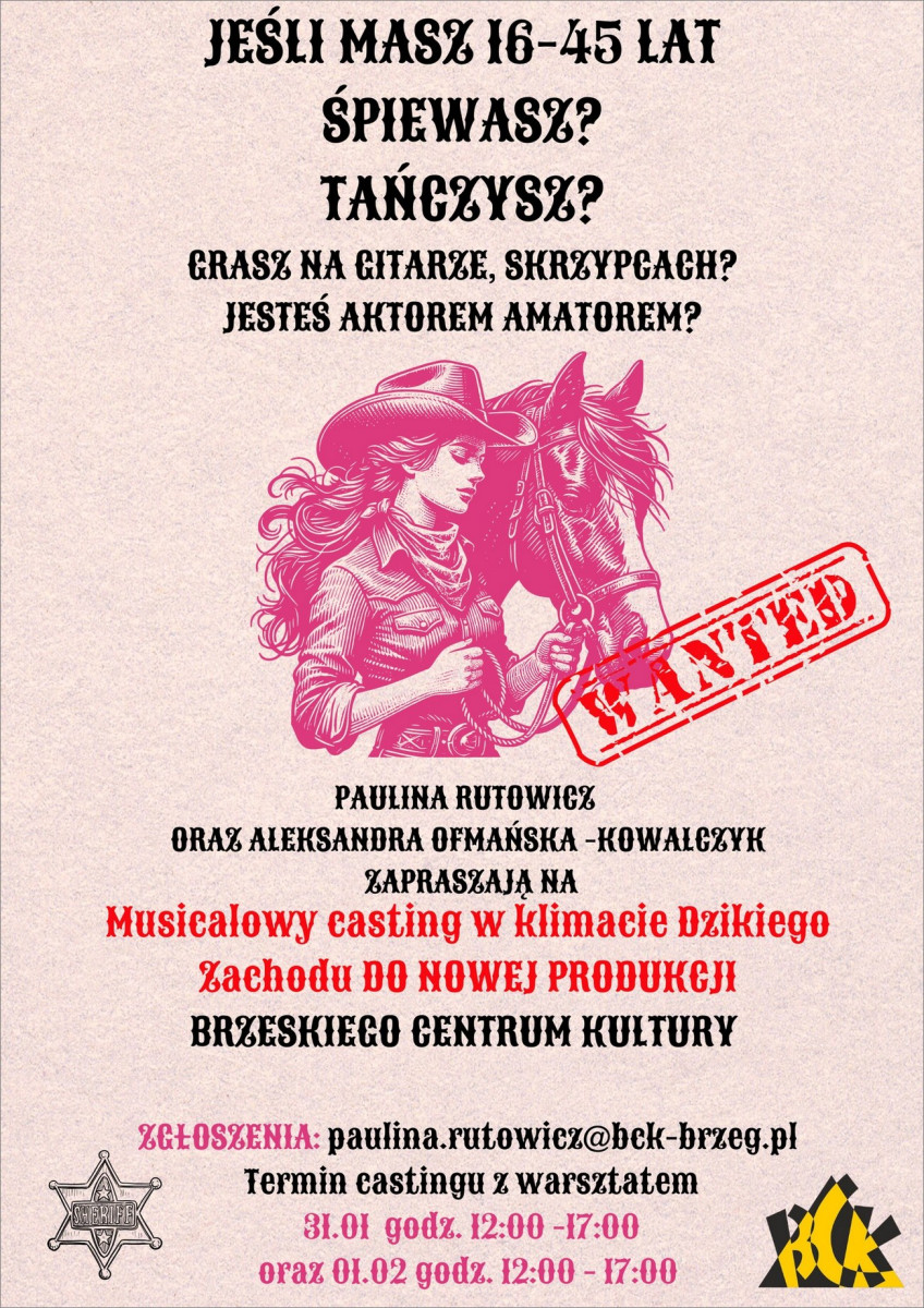 Brzeskie Centrum Kultury zaprasza na casting do nowego musicalu inspirowanego Dzikim Zachodem. Projekt przygotowują Paulina Rutowicz oraz Aleksandra Ofmańska Kowalczyk. To propozycja dla osób w wieku od 16 do 45 lat, zarówno tych z doświadczeniem scenicznym, jak i amatorów, którzy chcą sprawdzić się w nowej roli.