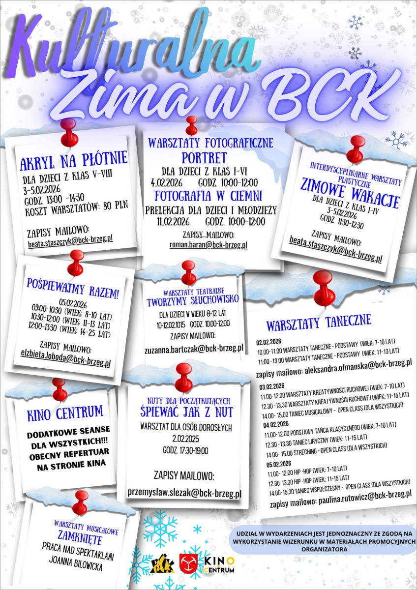 Ferie zimowe w Brzegu zapowiadają się bardzo intensywnie. Brzeskie Centrum Kultury przygotowało bogaty program „Kulturalna Zima 2026”, w którym znalazły się warsztaty plastyczne, teatralne, wokalne, taneczne i fotograficzne. Zajęcia skierowane są do dzieci, młodzieży oraz dorosłych. Większość warsztatów jest bezpłatna, a liczba miejsc ograniczona.
