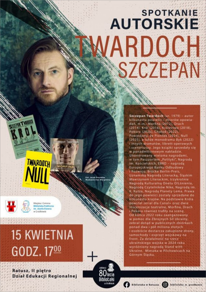 Miejska i Gminna Biblioteka Publiczna im. Józefa Elsnera w Grodkowie zaprasza na wyjątkowe spotkanie autorskie ze Szczepanem Twardochem, jednym z najważniejszych współczesnych pisarzy w Polsce. To okazja, by spotkać autora bestsellerowych powieści, porozmawiać o literaturze i posłuchać o kulisach jego twórczości.