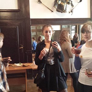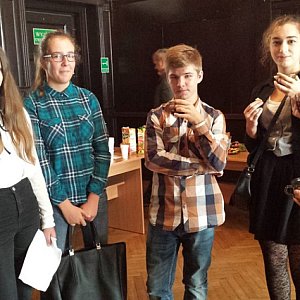 EMILKA CYPRYCH z kl.2b, ZUZIA MACIERZYNSKA z kl.2b, NIKOLA NOWAKOWSKA z kl.3b i czarujący ignorancją zasad i konwenansów - KACPER TYMKÓW z kl. 3b. Prezentacje gimnazjalistów dotyczyły bliskich im tematów, Emilka opowiadała o tym, gdzie wywiódł ją duch gór...i zawędrowaliśmy do czeskiego Skalnego Miasta i w Karkonosze; Zuzia błądziła po wrocławskim Rynku, Nikola opowiedziała mrożącą krew w żyłach historię paktu z diabłem i tajemniczej windy w bajkowym (zdawałoby się) Zamku w Mosznej, a Kacper uwodził głosem i argumentami, zachwycając się iluzjonistycznymi freskami w Kościele p.w. św. Krzyża w Brzegu...ale gadulstwo zwiodło go na manowce i przekroczył regulaminowy czas wypowiedzi prawie o 3 minuty.
