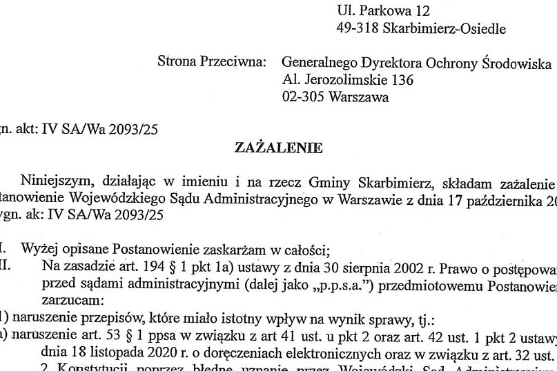 Wojewódzki Sąd Administracyjny w Warszawie odrzucił skargę Gminy Skarbimierz na decyzję środowiskową dla budowy obwodnicy Brzegu, uznając ją za złożoną po terminie. Wójt Andrzej Pulit nie zgadza się z tym stanowiskiem i złożył zażalenie do Naczelnego Sądu Administracyjnego. Jego zdaniem termin został zachowany, a decyzja sądu jest błędna. Jeśli NSA przyzna rację gminie, sprawa będzie toczyć się dalej. Jeśli nie – będzie to ostateczny koniec batalii, a obwodnica powstanie w kształcie proponowanym przez GDDKiA.
