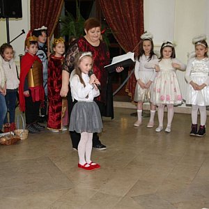 Dzieci wystąpiły z przedstawieniem jasełkowym, które wcześniej prezentowały podczas świetlicowej Wigilii. Poza scenkami związanymi z Bożym Narodzeniem, były też kolędy w wykonaniu małych artystów. Nad całością czuwała Pani Ela Kosińska, która występ z dziećmi przygotowała i poprowadziła.
