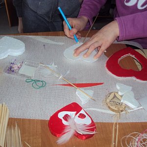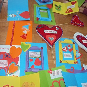 Wiele radości przyniosły nam zajęcia plastyczne, tym razem inspirowane walentynkami. Najpierw były serca: małe i wielkie, czerwone i złociste, na patyku i na sznurku, z cekinami, kokardami, świecącymi tasiemkami. Bardzo różne i bardzo piękne. Potem zdobiliśmy drewniane medaliony - zawieszki również z miłosnymi wyznaniami. Radą i doświadczeniem podczas warsztatów plastycznych służyły nam panie: Teresa Rączka - nauczycielka ze Szkoły Podstawowej w Łosiowie i Regina Krańcioch - florystka i dekoratorka. To dzięki nim dziecięce "serduszkowe" inspiracje mogły być realizowane sprawnie i bez większych problemów.