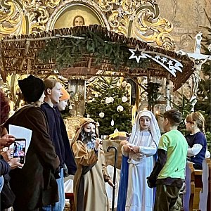 Mszy Świętej przewodniczyło trzech kapłanów: ks. proboszcz Aleksander Michał Drożdż, ks. Zbigniew z Jankowic oraz jego przyjaciel – misjonarz, człowiek o bogatym doświadczeniu życiowym, ks. Wiktor z Portugalii. Na zakończenie złożono serdeczne życzenia urodzinowe ks. Zbigniewowi, który w tym dniu obchodził swoje święto. Po jasełkach kościół wypełniły gromkie owacje. Przedstawienie było prawdziwą ucztą dla oczu i serca. Połączyło przeszłość z teraźniejszością, pokazując, że historia Bożego Narodzenia wciąż się powtarza – tu i teraz, w naszych codziennych wyborach. To widowisko przypomniało wszystkim, byśmy nie zagubili prawdziwego sensu świąt. Bo Boże Narodzenie to nie dekoracje i pośpiech, lecz miłość, otwarte serce i gotowość, by dostrzec drugiego człowieka.