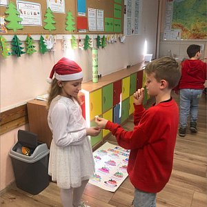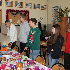Przedstawienie wprowadziło wszystkich w świąteczny nastrój, skłoniło do refleksji i przypomniało o istocie Bożego Narodzenia. Następnie uczniowie spotykali się w klasach wraz ze swoimi wychowawcami na wigiliach klasowych. Był to czas pełen serdeczności i wzajemnej życzliwości. Podczas tych wyjątkowych spotkań dzielono się opłatkiem, składano świąteczne życzenia oraz wspólnie śpiewano kolędy i pastorałki - te najpiękniejsze, polskie, które od pokoleń wprowadzają w niezwykły, świąteczny nastrój. Wspólne rozmowy i kolędowanie sprawiały, że panowała ciepła, rodzinna atmosfera, sprzyjająca budowaniu więzi i wspólnoty. Zgodnie z tradycją obowiązywała zasada wspólnego stołu - każdy przynosił coś od siebie. Na stołach nie zabrakło świątecznych potraw: barszczyku z uszkami, pierogów, krokietów, pasztecików z kapustą, kapuśniaczków, ryb, makowców, pierników oraz różnorodnych ciast. W wielu klasach nieodłącznym elementem spotkania jest także wzajemne obdarowywanie się drobnymi upominkami. Wcześniejsze losowanie sprawia, że do samego końca pozostaje tajemnicą, kto był „Gwiazdką” dla kolegi lub koleżanki, co dostarcza uczniom wielu emocji i radości.