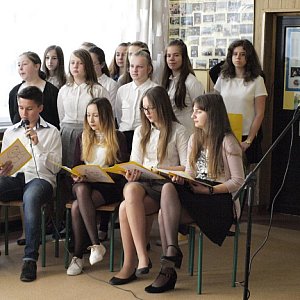 i pięknym śpiewem szkolnego chóru, który wykonał takie pieśni jak: "Barka", " Moje miasto Wadowice", "Słowiański Papież", a także współczesne utwory opiewające postać Papieża. Tematyka apelu zainteresowała wszystkich zebranych, którzy w ogromnym skupieniu wsłuchiwali się w słowa występujących. Momentem szczególnie poruszającym było odśpiewanie przez uczennicę Magdalenę Zalewską przepięknej pieśń o miłosierdziu Bożym. Zebrani obejrzeli także prezentację multimedialną przygotowaną przez p. E. Chruszczewską, która była wzruszającym wspomnieniem osoby Jana Pawła II. Ojciec Święty dał świadectwo niezwykłej siły ducha, wiary, miłości Boga i człowieka. Był uosobieniem dobra, prawdy i mądrości. Jego obecność na zawsze została zapisana w życiu każdego z nas.