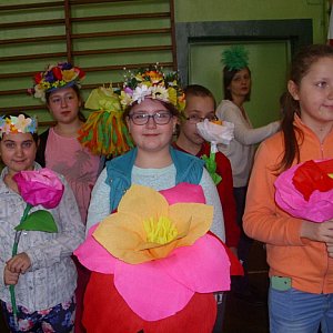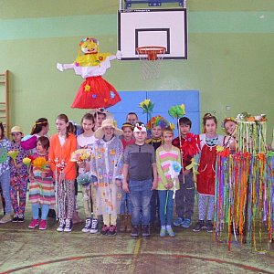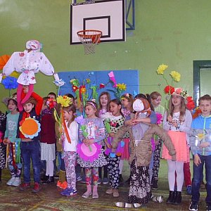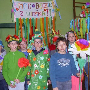 Od pierwszej lekcji w szkole było kolorowo i wiosennie. Zabawę rozpoczęto od wspólnego spotkania wszystkich uczniów ze szkoły podstawowej w sali gimnastycznej, gdzie każda klasa prezentowała swój okrzyk, zawołanie wiosenne, piosenkę oraz własnoręcznie przygotowany kolorowy gaik. Wszyscy uczniowie byli przebrani w kolory tęczy, nie zabrakło: Żabek, Panien Wiosenek, Rolników, Gospodyń, Kwiatów, Zwierzątek i innych postaci. Apel prowadził przewodniczący Samorządu Uczniowskiego SP - Mateusz Markowski.