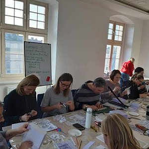 Było dużo wycinania, klejenia i dyskusji nad odpowiednią kompozycją. Pracy było sporo, ale wszystkim dopisywał dobry nastrój i wszyscy wytrwali do końca. Uczestniczki kończyły zajęcia z szerokim uśmiechem na ustach, więc na pewno były zadowolone z efektów własnej pracy. Dziękujemy wszystkim kursantkom za udział w warsztatach i zapraszamy na kolejne spotkania.