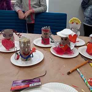 tą mieszanką tekst. Ale wszystko się udało i powstały bardzo pomysłowe i kolorowe karteczki. "Po prostu koci świat" - to hasło kolejnych dwóch spotkań. W czasie zajęć powstały różne figurki kotów, a nawet całe kocie rodzinki :) Miłośnicy kotów, bo wszyscy zgodnie przyznali, że koty są kochane, rozwiązywali też krzyżówki