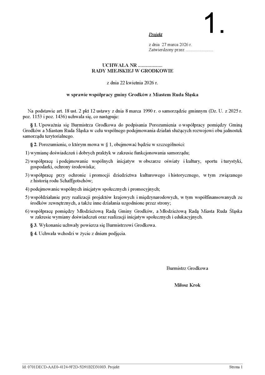 W projekcie uchwały wskazano także na współpracę młodzieży. Młodzieżowa Rada Gminy Grodków miałaby współdziałać z Młodzieżową Radą Miasta Ruda Śląska. Celem jest wymiana doświadczeń i rozwijanie aktywności obywatelskiej wśród młodych mieszkańców.