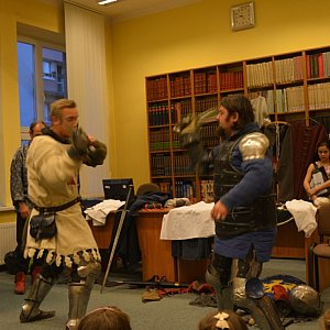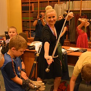 Można było zobaczyć sławnego pisarza Henryka Sienkiewicza i posłuchać wywiadu w jaki sposób zostaje się sławnym pisarzem. Uczniowie z PSP nr 10 w Opolu zaprezentowali kabaret i tańce do utworów H. Sienkiewicza. Następnie "Grodkowiacy" zaprezentowali się w tańcach dworskich i rycerskich. Od godz. 19 wszyscy uczestniczyli w warsztatach: pisania gęsim piórem, czyli lekcja kaligrafii, malowania na tkaninie, malowali sakiewkę na dukaty (warsztaty prowadziła p. Beata Sikorska-Żyrek) oraz wznosili budowle zamkowe. Za wykonane zadania otrzymywali dukaty i zamieniali je na nagrody. Ostatnim punktem atrakcji było spotkanie z Opolskim Bractwem Rycerskim. Posłuchaliśmy o obyczajach średniowiecznych, zobaczyliśmy w jaki sposób ubiera się do walki rycerz, jak wygląda walka rycerska. Ponadto mieliśmy możliwość przymierzania strojów i innych akcesoriów rycerskich. Cennym doświadczeniem była nauka tańców średniowiecznych. Na pewno wykorzystamy je w naszym zespole. Na koniec zrobiliśmy wspólne zdjęcie i Pani dyrektor Pedagogicznej Bibliotece Wojewódzkiej w Opolu podziękowała zespołowi za wspaniały występ i aktywne uczestnictwo w Nocy Kultury.