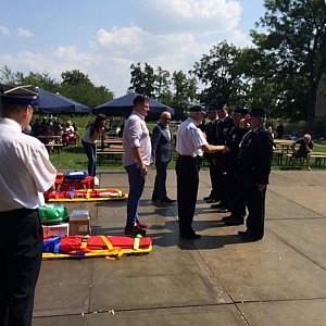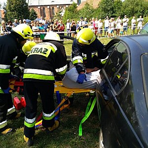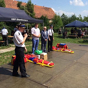 Po zwiedzaniu galerii uczestnicy festynu byli świadkami przekazania druhom z OSP Łukowice Brzeskie i OSP Zwanowice sprzętu ratownictwa medycznego. Sprzęt współfinansowano ze środków "Funduszu Sprawiedliwości", którego dysponentem jest Minister Sprawiedliwości. Powyższy sprzęt, min. defibrylator i torby sanitarne wręczył strażakom ochotnikom Wójt Gminy Skarbimierz Andrzej Pulit. Po uroczystości wręczenia sprzętu druhowie przygotowali pokaz akcji ratowniczej po wypadku drogowym, w którym narastająco wzięło udział 3 zespoły strażackie z OSP Łukowice Brzeskie, OSP Lipki i OSP Zwanowice. Sprawność druhów została nagrodzona oklaskami uczestników festynu.