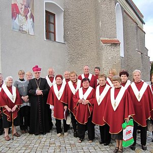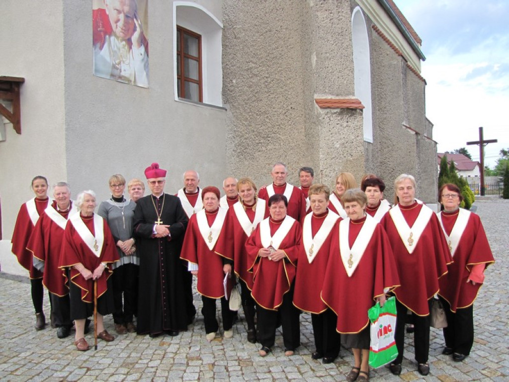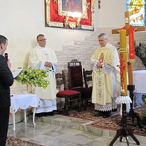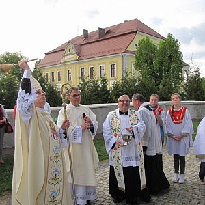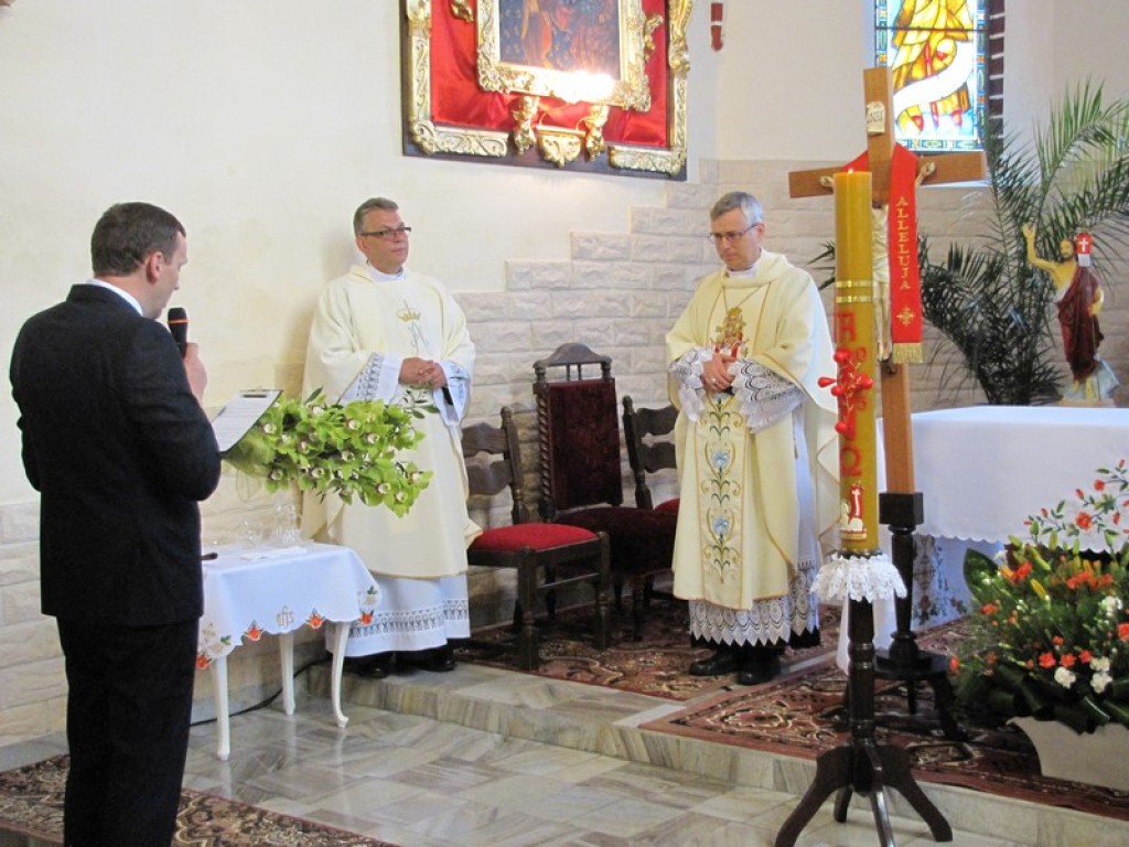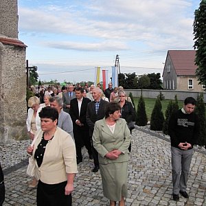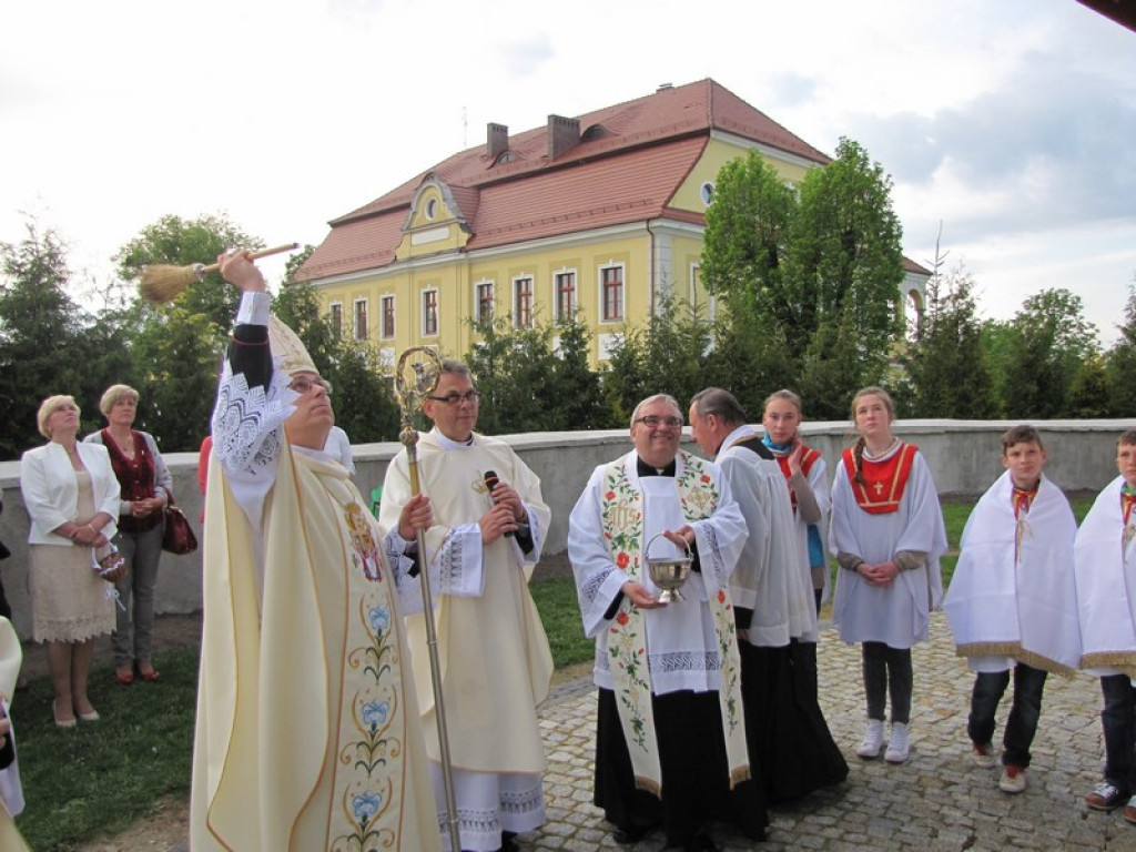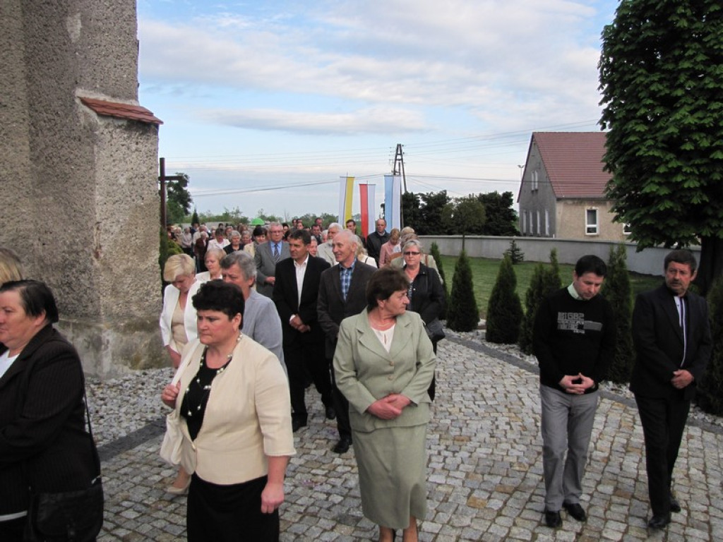 Mszę św. celebrował Ks. Biskup Andrzej Siemieniewski, Biskup Pomocniczy Archidiecezji Wrocławskiej. Msza święta miała charakter odpustowy z okazji święta patronki parafii Najświętszej Marii Panny Królowej Polski. Ks. Biskup nawiązał w liturgii słowa do święta maryjnego podkreślił też, że fakt dążenia parafian do odbudowy wieży kościelnej świadczy o silnej wspólnocie wśród mieszkańców wioski oraz podziękował i podkreślił rolę wszystkich, którzy w jakikolwiek sposób się do tego wspaniałego dzieła przyczynili. W czasie mszy św. odbyła się tradycyjna procesja wiernych i duchowieństwa oraz poświęcenie odbudowanej wieży.