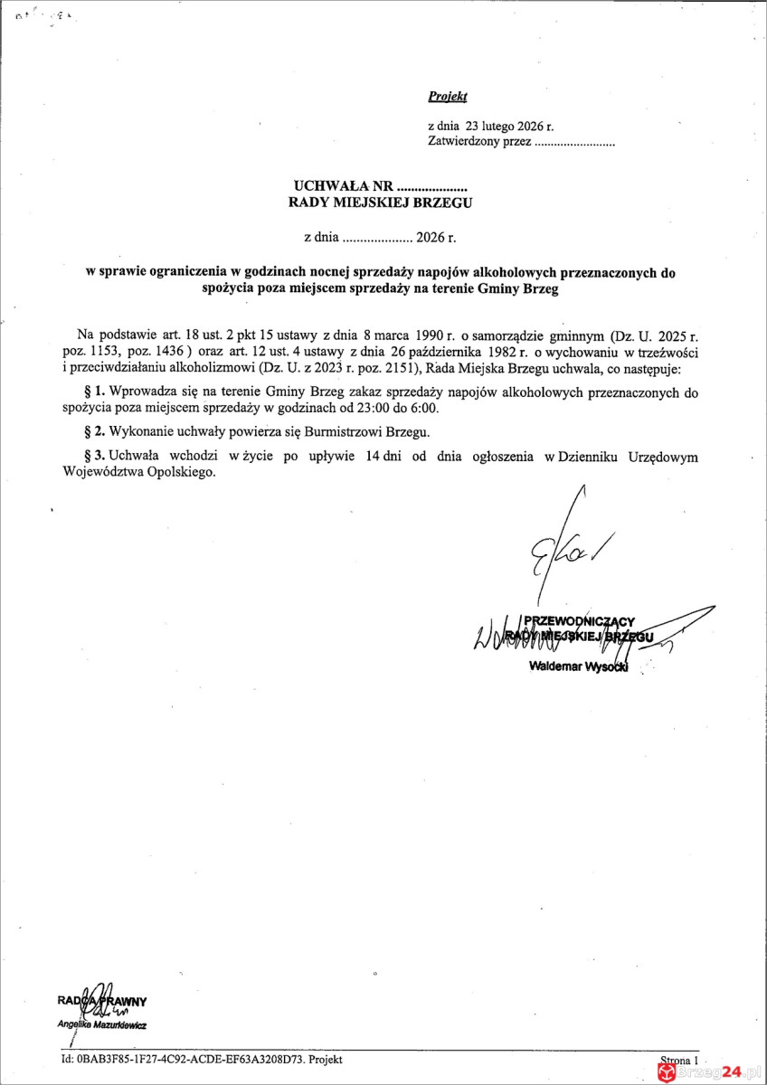 Projekt uchwały zakładał wprowadzenie zakazu sprzedaży napojów alkoholowych przeznaczonych do spożycia poza miejscem sprzedaży w godzinach od 23:00 do 6:00 na terenie całej gminy Brzeg. Ograniczenie nie obejmowałoby lokali gastronomicznych, gdzie alkohol może być spożywany na miejscu.