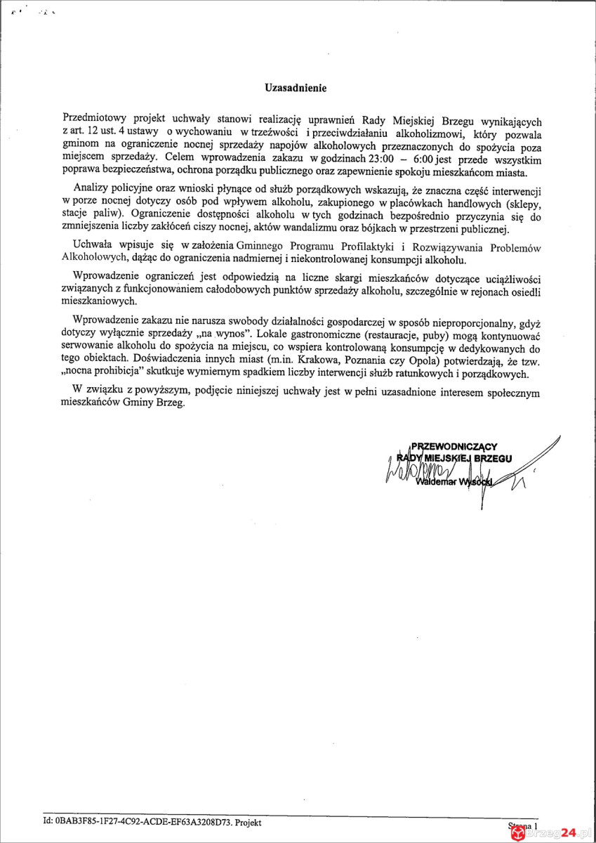 Inicjatorem uchwały był przewodniczący Rady Miejskiej Waldemar Wysock Projekt powstał na wniosek komendanta policji w Brzegu insp. Michała Karońskiego, który był pomysłodawcą i zwracał uwagę na skalę nocnych interwencji związanych z alkoholem.