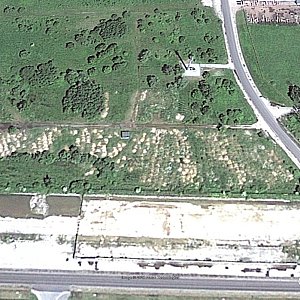 Rok 2017 (październik): To zdjęcie satelitarne zostało wykonane w większej rozdzielczości. Na placu obok hali po lewej stronie widać składowaną ziemię, ciężki sprzęt typu ładowarki do kruszywa oraz ciężarówkę z naczepą. Na terenie zielonym widać już pierwszy nasyp uformowany z ziemi. Pomiędzy placem z podłożem z płyt betonowych, a terenem zielonym utworzony został przejazd.