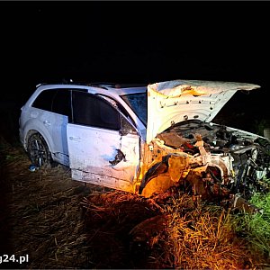 Audi Q7 po zderzeniu dachowało na polu. Samochodem podróżowało trzech obywateli Ukrainy - kierowca oraz dwóch pasażerów. Jak ustalili policjanci, wszyscy byli pod wpływem alkoholu.