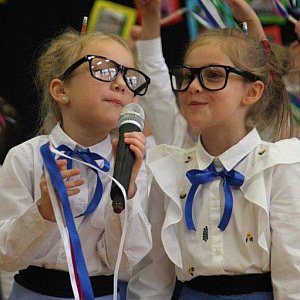 "Uwaga wszyscy! Wchodzą pierwszaki!" - na dźwięk tych słów uczestniczący w tym dniu goście: rodzice, uczniowie, wychowankowie i nauczyciele Publicznego Przedszkola nr 10, a także inni przyjaciele szkoły wraz z panią dyrektor Lucyną Bończak i panią wicedyrektor Iwoną Kiesińską, uroczyście przywitali młodych uczniów Publicznej Szkoły Podstawowej nr 8. Sześćdziesięcioro ośmioro uczniów klas pierwszych zaprezentowało się barwnie i pomysłowo. Każda z trzech klas świętujących w tym dniu miała inne przebranie i przez całą akademię prześcigała się w odgadnięciu, jaką rolę ma spełniać szkoła i czego tak naprawdę powinna nauczyć młodego człowieka. Uczniowie z klasy 1a wraz z wychowawcami: Dorotą Wojciechowską i Beatą Kosztowniak prezentowali typ ucznia - artysty, który w szkole chce przede wszystkim dobrze się bawić, śpiewać, tańczyć, rozwijać kreatywność oraz zacieśniać więzi z innymi dziećmi. Wychowankowie klasy 1b przedstawili typ ucznia - naukowca. Wraz z panią Katarzyną Kęśminowicz przypominali o bardziej powszechnej roli szkoły, która pomaga w nauce czytania, pisania, liczenia, odkrywania co dzień nowych tajemnic z dziedziny nauki. Patrząc na uczniów klasy 1c od razu wiadomo było, że pani Iwona Pasternak przygotowała swoją grupę na podobieństwo sportowców. Stroje sportowe, które ich zdobiły, świetnie się sprawdziły podczas tańca z pomponami.