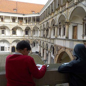 Pierwsze spotkanie odbyło się w Zamku Piastów Śląskich w Brzegu. Tam uczniowie dzięki Pani Barbarze Fomicz dowiedzieli się wiele ciekawych rzeczy dotyczących architektury zamku i tego co architekci i budowniczowie brali pod uwagę przy jego powstawaniu. Uczniowie uczestniczyli również w grze, w której należało na dziedzińcu zamkowym dostrzec jak najwięcej podanych w "karcie patrolowej" brył geometrycznych - zadanie to znakomicie udało się wszystkim uczniom. W jednej z zamkowych sal czekała następna gra, tym razem w małych grupach należało układać z klocków dokładnie takie figury przestrzenne jakie wylosowało się na kartach. Celem gry było kształtowanie intuicji geometrycznej, orientacji w przestrzeni i kombinatorycznego myślenia. Gra wzbudziła wiele emocji i pozytywnych wrażeń. Serdecznie dziękujemy Pani Barbarze Fomicz za pomoc w realizacji tych zajęć.