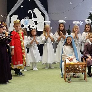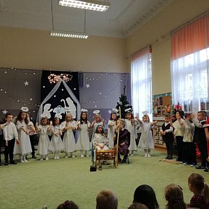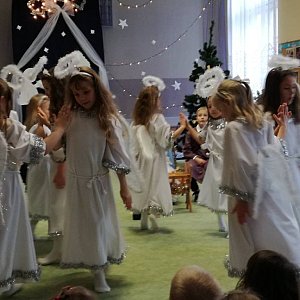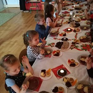 W naszym przedszkolu już wszyscy odczuwali magię tych wyjątkowych Świąt. Grupa Gepardów przygotowała Jasełka dla całej społeczności przedszkolnej i dla swoich rodziców. Była opowieść wigilijna ze świętą rodziną, aniołami, pasterzami i królami oddającymi cześć Dzieciątku. Nie zabrakło pięknych kolęd, życzeń świątecznych i opłatka. Wszystkie dzieci odświętnie ubrane wraz z personelem zasiadły do wigilijnej przedszkolnej wieczerzy. Panie z kuchni przygotowały pyszny wigilijny barszcz i pierogi a rodzice zadbali o słodkości.