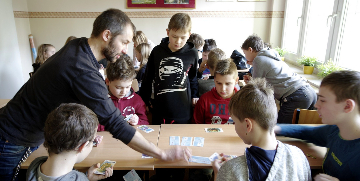 Nieco inaczej do finansów podeszli uczniowie klas 5-7 i gimnazjum. Tuż po oficjalnym rozpoczęciu czekali oni w wyznaczonych gabinetach na przyjście ważnych gości. W klasach piątych uczniów odwiedziła pani Sylwia Palacz- Kierownika Zespołu z Banku PKO BP, która w bardzo ciekawy sposób przeprowadziła prelekcję na temat finansów i rachunkowości. Tematy związane z utworzeniem konta, zawieraniem kredytów i dokonywaniem przelewów pieniężnych nie będą już teraz obce piątoklasistom. Okazało się też, że o finansach można uczyć się poprzez zabawę. Udowodnił to kolejny gość - pan Andrzej Miller z Księgarni "Sowa", który w kreatywny sposób przedstawiał zasady gier planszowych z zakresu finansów. W tym celu zaprezentował kilka propozycji gier, które w prosty sposób przybliżyły dzieci do świata bankowości i pieniędzy. Następnie uczniowie wyszukiwali, w specjalnie zakupionych na ten dzień tabletach, ceny produktów żywnościowych i higienicznych. Tworzyli w grupach budżety domowe i systemy oszczędzania pieniędzy. Po skończonej pracy dzieci grały na tabletach w gry finansowe.