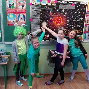 Od samego rana korytarze szkolne przeżywały inwazję astronautów, kosmitów, ufoludków różnego kalibru, koloru i wyglądu, w zależności od zamieszkiwanej planety....No cóż, skoro nie było uczniów, to i zwyczajne lekcje zostały odwołane, a zajęcia były kosmiczne, by nasi nieziemscy goście czuli się komfortowo. Na początek w poszczególnych klasach - w grupach, w parach i indywidualnie tworzono przestrzenne prace związane z tematyką kosmosu. Wyprodukowano rakiety, spodki latające, makiety z planetami Układu Słonecznego, schematy Mlecznej Drogi. Nikt z obecnych nie miał wątpliwości, że wszystkie te niesamowitości zawdzięczamy wielkiemu odkryciu naszego patrona, który "wstrzymał Słońce, ruszył Ziemię". Imię Mikołaja Kopernika tego dnia było odmieniane przez wszystkie przypadki. Aż dziw bierze, że w naszej szkole klasy I -III posiadają tak imponującą wiedzę o polskim geniuszu rodem z Torunia.