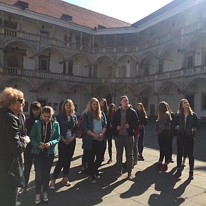Zwiedzanie rozpoczęliśmy na dziedzińcu, gdzie Pani kustosz Teresa Piasecka opowiedziała nam o architekturze Zamku oraz o jego dawnej funkcji - początkowo był warownią, potem zaś luksusową rezydencją, dziś natomiast jest siedzibą muzeum. Dowiedzieliśmy się także, że Zamek Piastów Śląskich określany jest jako "Śląski Wawel".