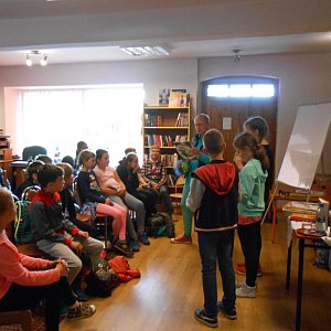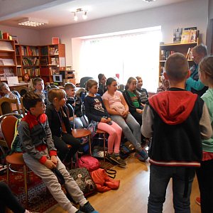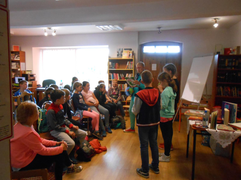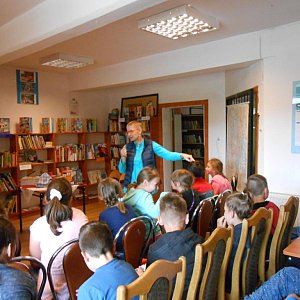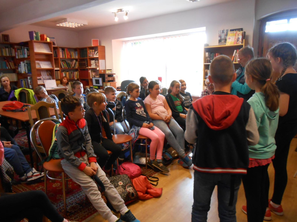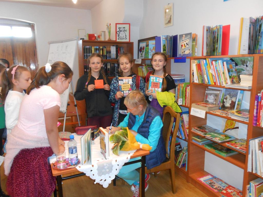 i Anną Machowską.Autorka czytała fragmenty książek, zadawała pytania i zachęcała do mini-konkursów i rozwiązywania zagadek literackich nagradzając każdą prawidłową odpowiedź słodyczami. Dla "ubarwienia" spotkania odpowiadali np. uczestnicy ubrani w paski, na czerwono lub zielono, lub ubrani w buty na rzepy, albo tylko ci którzy nie mieli kolczyków. Dynastia Miziołków -to realistyczny i bardzo zabawny serial powieściowy dla dzieci w wieku 10-12 lat i właśnie na tej książce autorka skupiła uwagę uczniów. Pytania dotyczyły lektury Dynastii Miziołków" np. Jak gotuje mama Miziołka? Co gubi Mamiszon? Albo należało wymienić dwa imiona potwora. Pisarka oprócz umiejętnosci pisarskich posiada również zdolności ilustratorskie.Zadaniem wybranych uczestników było na przykład opowiedzenie historyjki o smoku w czasie ,gdy autorka kreśliła jego postać. Konkurencję wygrywała osoba, która potrafiła najlepiej zmyślać. Przy książeczce Kto ty jesteś? czytany był tekst nawiązujący do ilustracji, a zadanie polegało na dopasowaniu z pamięci tekstu do przedstawionej ilustracji .