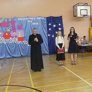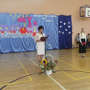Pan Jerzy Wrębiak życzył wszystkim udanych i bezpiecznych wakacji, natomiast pani dyrektor Anna Krokosz podsumowała kończący się właśnie rok nauki, podkreślając wspaniałe wyniki naszej szkoły w egzaminie gimnazjalnym. Okazuje się bowiem, że nasze osiągnięcia są niejednokrotnie wyższe niż średnia miasta oraz całego województwa.