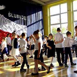 Już na początku swojego występu dzieci zgodnym chórem oznajmiły, że: "ślub będą brać ze szkołą". Specjalnym gościem uroczystości był mieszkający w szkole, wesoły Duszek Aplaus, który zapewnił, że uważnie przyglądał się zachowaniu dzieci podczas lekcji i przerw. Pierwszaki w wierszach oraz piosenkach zaprezentowały swoją wiedzę, świadomość czekających je obowiązków oraz znajomość zasad właściwego postępowania. Nie zabrakło również akcentu patriotycznego - utworów poetyckich i wokalnych sławiących naszą Ojczyznę, ponieważ uroczystość zbiegła się ze 100 - leciem odzyskania przez Polskę niepodległości. Dzieci zdały celująco egzamin ze znajomości "Katechizmu polskiego dziecka" i wykonały nasz narodowy taniec - krakowiak. W czasie uroczystości nie zabrakło również życzeń i podziękowań dla nauczycieli w związku ze zbliżającym się Dniem Edukacji Narodowej.