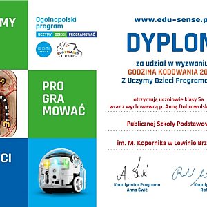 Za udział w Godzinie Kodowania uczniowie otrzymali imienne pamiątkowe certyfikaty oraz dyplom dla klasy 5a. Godzina Kodowania jest elementem realizowanego przez uczniów ogólnopolskiego programu edukacyjnego ,,Uczymy Dzieci Programować".