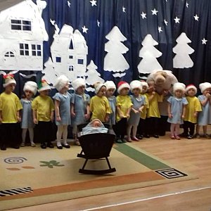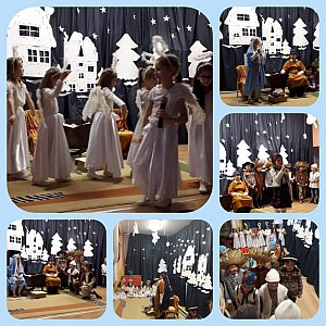 Dzieci wspólnie z nauczycielkami wykonywały świąteczne stroiki, dekorowały swoje sale, ubierały choinki. Bardzo chętnie śpiewały piosenki o tematyce świątecznej i bawiły się podczas zabaw ruchowych. W związku z tym, że był to przedświąteczny okres w każdej grupie odbyły się przedstawienia jasełkowo- zimowe dla rodziców -w grupie I Maleństwa przedstawienie pt. "Świąteczny nastał czas", w grupie II Króliczki i gr III Prosiaczki -przedstawienie zatytułowane "Betlejemska dobranocka" , w grupie IV Tygryski -"Zmartwienie śnieżynek",natomiast w grupie V Kubusie -" On jest Królem".